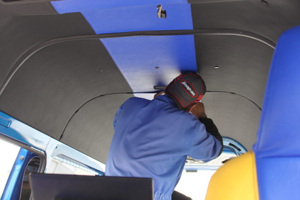 社長のハイエースの車内を青と黒の皮を張り付けしてい…